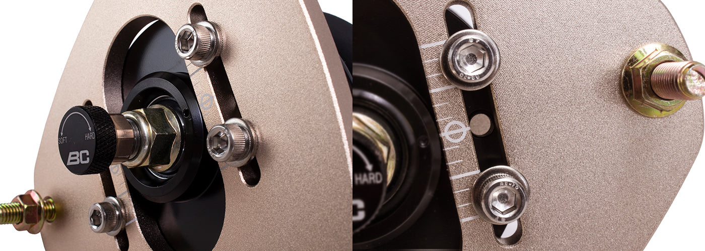 If its possible to include camber adjustment on your vehicle then the BC Racing coilovers automatically include camber adjustable aluminium pillowball top mounts. These feature the same high quality Japanese manufactured pillowball but give the added benefit of an adjustable top mount that allows camber to be set to suit your needs be it road, track or drift.