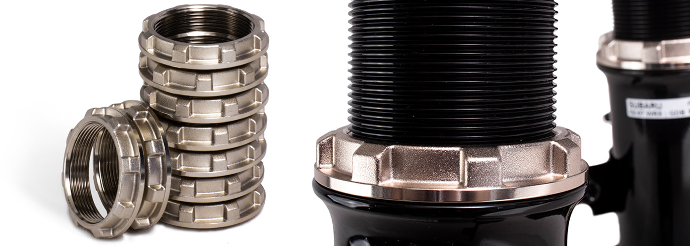 Coilovers use a locking collar to prevent the bottom mount becoming loose. If the bottom mount becomes loose then the damper body can work its way down into the bottom mount so reducing ride height on that one corner which can lead to dangerous handling characteristics. This is a very common problem for coilovers in general. BC Racing utilise an innovative and patented designed lower locking collar with a bevelled edge that seats into a corresponding bevel in the coilover bottom mount. This vastly increases the surface area that the locking collar works on and so prevents the common and dangerous problem of the locking collars working loose.